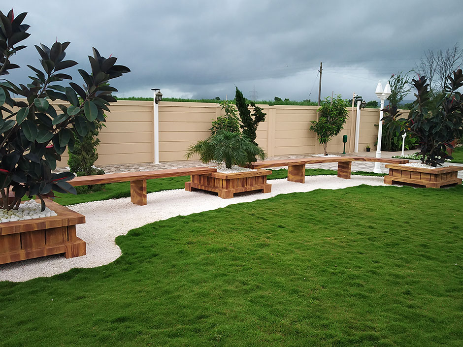 We build natural looking log huts, garden furniture, bridges, pathways, ornamental walls, murals, decorative pots of various sizes, sculptures, R.C.C. bamboos, Wooden flooring, wall cladding, bamboo fencing, animal shades and Agro related fabrication for our clients.